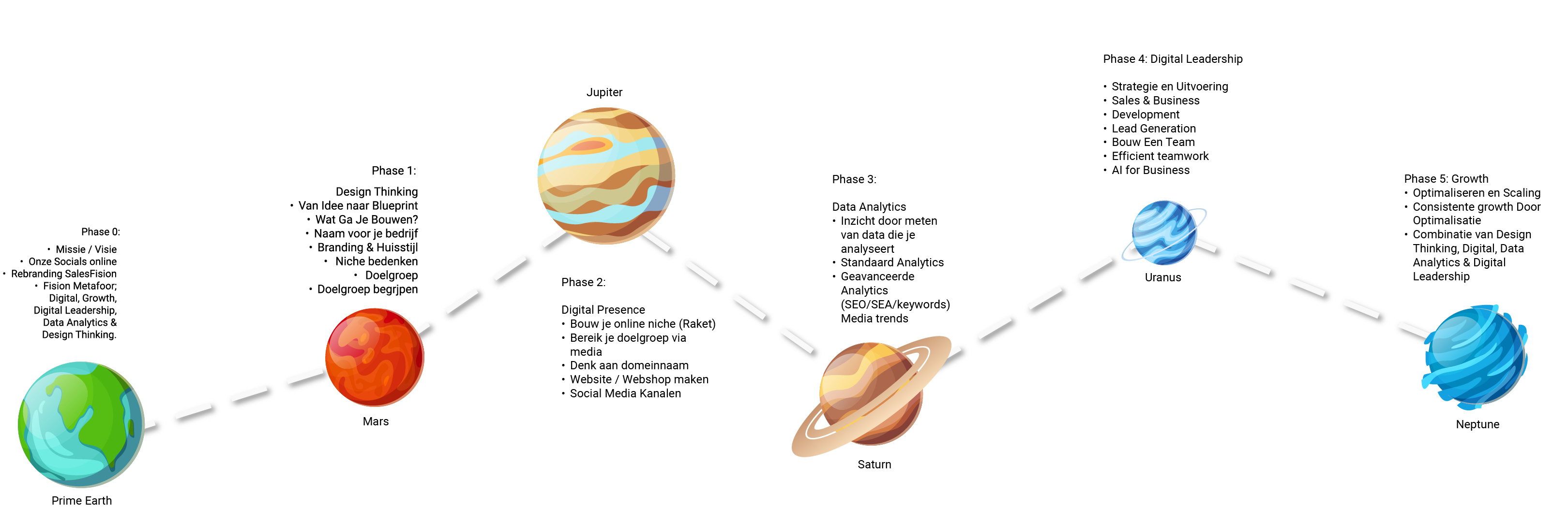 Once your foundation is in place, it’s time for the next step: Design Thinking. In Phase 1, we land on Mars to explore creativity, brand experience, developing a compelling name, a striking logo, and a consistent visual identity. This is where your strategy takes shape in a visual and tangible concept—bringing your business to life in a way that resonates and inspires.